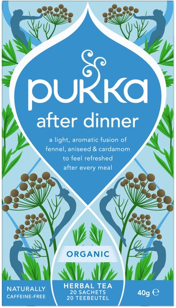 • Pukka After Dinner – een verfrissend moment na elke maaltijd. Pukka After dinner is een blend met anijszaad, venkelzaad, kardemompeulen, zoethout, korianderzaad en kurkumawortel. Gemaakt van 100% biologische ingrediënten die duurzaam verbouwd zijn.Breng deze heerlijke kruiden tot leven door ze tot 15 minuten in vers gekookt water te laten trekken.Een doosje bevat 20 individueel verpakte theezakjes die volledig biologisch afbreekbaar zijn.