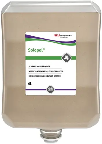 • Solopol® is een handreiniger voor zware vervuilingen een oplosmiddelvrije handreinigingspasta met schrobberende bestanddelen om zware vervuilingen zoals olie, vet, roet, smeermiddelen en algemeen vuil effectief te verwijderen