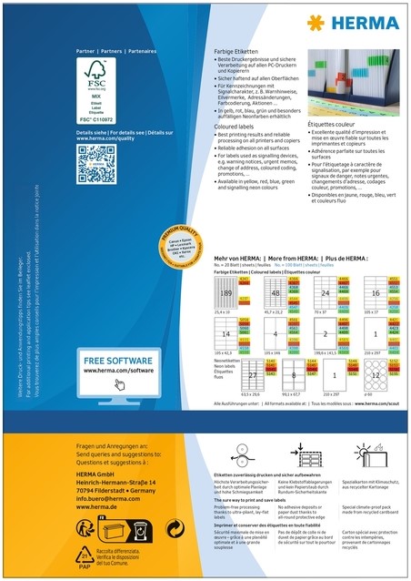 Gekleurde etiketten op A4-vellen, zelfklevend, etiketformaat 70x37mm groen, permanent hechtend, 100 vel per verpakking. Ideaal voor het labelen met signaalfunctie, bijv. waarschuwingsstickers, spoedaantekeningen, adreswijzigingen, kleurcodering, acties. Milieuvriendelijk: FSC® Mix Credit-gecertificeerd, chloorvrij gebleekt, oplosmiddelvrije contactlijm. Etiketten zijn 100 % recyclebaar via het oud papier, verpakking van gerecycled karton. Zeer goede drukresultaten op alle laser- en inkjetprinters, kopieerapparaten, kleurenlaserprinters en kleurenkopieerapparaten. Storingvrije verwerking dankzij veiligheidsrand rondom en optimale vlakligging. Gratis softwareoplossingen: www.herma.com/software.