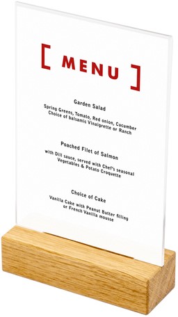 • Presenteer jouw menu’s, acties of mededelingen stijlvol met de IEZZY menukaarthouder T tafeldisplay A6. Deze compacte display combineert een heldere plastic houder met een duurzame eikenhouten voet, wat zorgt voor een tijdloze en professionele uitstraling op elke tafel of toonbank. De T-vormige standaard maakt het eenvoudig om documenten vanaf de zijkant te plaatsen en te wisselen, ideaal voor dagelijks gebruik in cafés, restaurants, hotels en kantines. Of je nu een promotie wilt uitlichten of een menu elegant wilt presenteren, deze houder biedt optimale zichtbaarheid én stevigheid. De perfecte mix van functionaliteit en design in A6-formaat. Kenmerken: