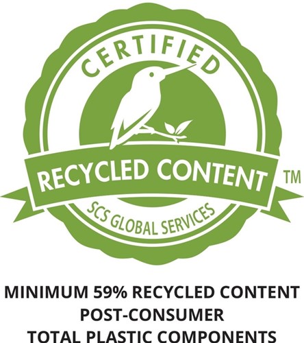 • Gecertificeerd gerecycled materiaal dat voldoet aan de SCS Recycled Content Standard V8-0 voor minimaal 59% post-consumer recycled materiaal van de totale kunststofcomponenten. Met uitzondering van de printplaat.