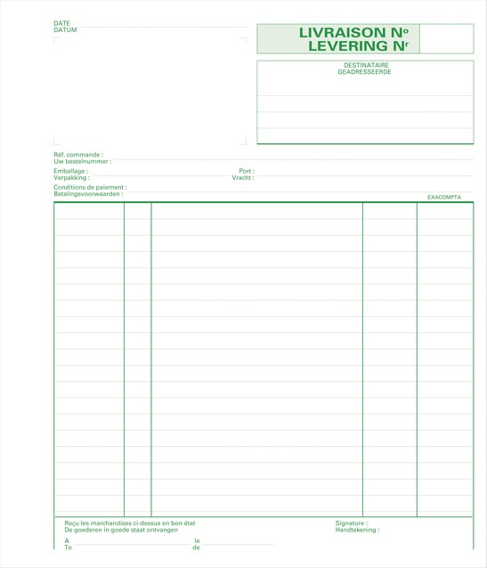 Leveringen 21x18cm 50 blad doorschrijfpapier dupli - Tweetalig Boek met afleveringsbonnen met behoud van een kopie. Voorzien van een eigendomsvoorbehoud clausule.50 genummerde bladen in 2 exemplaren (1 origineel + 1 kopie) Het 1ste blad is micro geperforeerd en is gemakkelijk uit te scheuren, het 2de blad blijft in het boekje De kwaliteit van het zelfkopiërend papier staat garant voor een nette en snelle kopie met een uitstekende transcriptie van het origineel. Dank zij het gebruik van een lijm van superieure kwaliteit en een verstevigde rug, zijn de doorschrijfboeken van Exacompta aangepast aan een veelvuldig gebruik, zowel op kantoor als buiten. 100% Frans fabricaat.