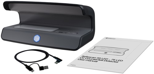 • Inhoud verpakking; Safescan 75 LED, USB-C kabel, USB-A converter, handleiding.