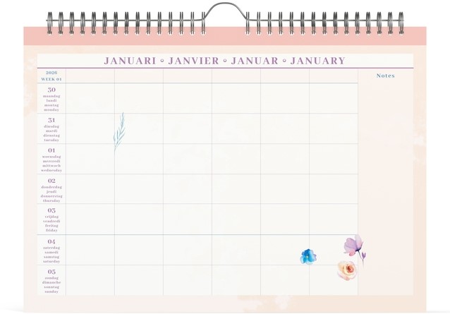 Familiekalender 2026 Lannoo 310x220 Flowers watercolour 7dag/1pag lila