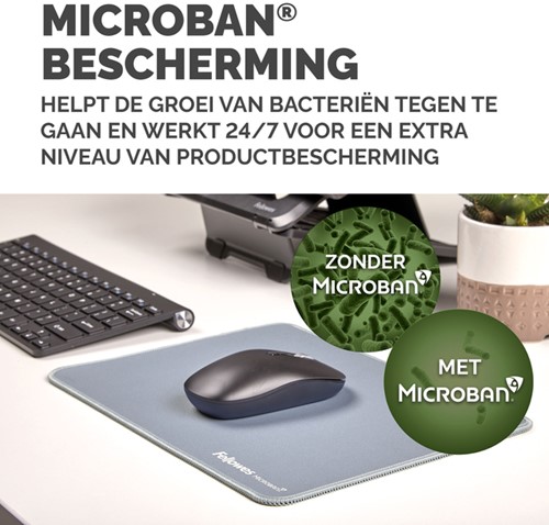 Meer dan 25% groter dan onze standaard muismatten voor meer bewegingsvrijheid, waardoor kleine herhaalde bewegingen die pijn in de pols kunnen veroorzaken, worden verminderd. Bescherm uw bureaublad en verbeter de prestaties van uw muis met deze muismatten die geschikt zijn voor optische en lasermuizen. De ingebouwde Microban®-bescherming helpt de groei van bacteriën te voorkomen en werkt 24/7 voor een extra bescherming van het product. Gemaakt van 83% gerecycled materiaal. De antislipbasis houdt de muismat de hele dag op zijn plaats. Duurzame platte stiksels voorkomen rafelen. Gemaakt om lang mee te gaan, met 5 jaar garantie.