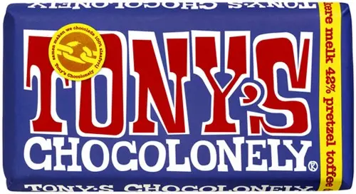 Chocolade Tony's Chocolonely donker melk pretzel toffee reep 180gr