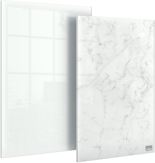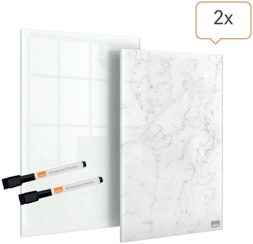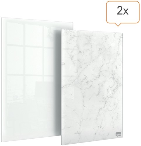 • 2x droog uitwisbare mini notitieborden van glas met een stijlvol, randloos ontwerp: 1x briljant wit en 1x modern marmereffect.