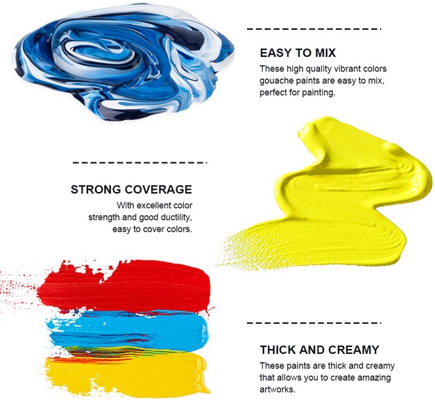 Gouacheverf behoort tot de serie wateroplosbare verf. Deze verf is gemaakt van dezelfde bindmiddelen en pigmenten als waaruit waterverf is samengesteld. Gouache heeft als toevoeging blanc fixe wat de verf zijn dekking geeft. Dit is ook meteen het verschil met aquarelverf. Door de dekkracht kan met gouache meer pasteus worden geschilderd. De dekkracht maakt het ook makkelijker om correcties te maken en kan je met lichte kleuren over donkere kleuren schilderen in tegenstelling tot aquarel. Bij aquarel zal de transparantie ervoor zorgen dat lichte kleuren de donkerder schaduwen die eronder liggen niet zullen bedekken. Met deze kleuren kun je prachtige kleurencombinaties maken. De gouache is een dekkende verf waarmee je mooie, streeploze en matte oppervlakken kunt schilderen. De verf is waterverdunbaar en droogt binnen enkele minuten, dus je kan lekker vlot doorwerken. Te gebruiken op verschillende ondergronden zoals papier, karton en hout. Elke kleur heeft een inhoud van 30 ml. En heeft een fantastische dikke consistentie die penseel- of spatelafdrukken zal vasthouden en je werk schitterende textuur zal geven. De premium gouache-verfset met 18 unieke opvallende levendige gouache kleuren biedt je een uitstekende selectie van levendige kleuren om je kunstwerk tot leven te brengen, ideaal voor professionele kunstenaars, jonge aspirant-kunstenaars, schilderliefhebbers, tieners en kinderen. Verbeterd en uniek ontwerp met minicups met uitstekend afdichtingsdeksel houdt je gouache-verf nat en romig voor prachtige schilderwerkjes, draagbaar formaat, gemakkelijk mee te nemen, perfect om binnen of buiten te leren schilderen. Gemaakt van milieuvriendelijk verfmateriaal met de certificeringen ACMI, EN71-3 en EN71-9. De gouache-verf van deze set heeft rijke pigmenten, is romig, niet giftig en wasbaar. Geschikt voor kunstenaars, volwassenen, tieners en kinderen. De verf zal niet barsten of afbrokkelen wanneer ze droog is en kan worden gereactiveerd met water. De nieuwe gouache-verfset wordt geleverd met een eenvoudig palet.