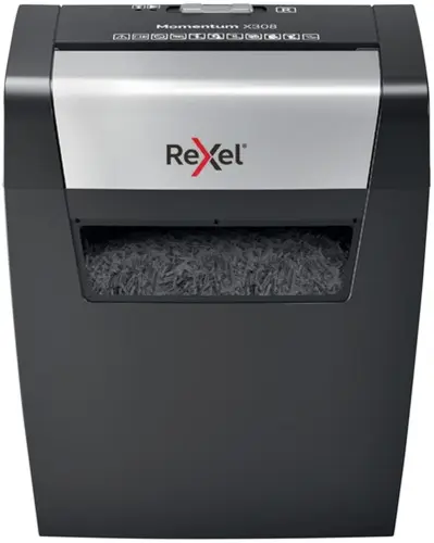 • De kracht om meer te vernietigen! De Rexel Momentum X308 Papierversnipperaar vernietigt tot wel 8 A4 vellen tegelijk, met een continue doorlooptijd van 3 minuten, maakt het een ideale machine voor thuis. P3, Cross cut snippers van 5x42mm. Een opvangbak van 15L (100 A4 vellen).