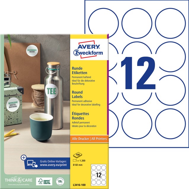 • De zelfklevende etiketten met een diameter van 60 mm zijn eenvoudig te bedrukken met behulp van de Avery online software en templates.