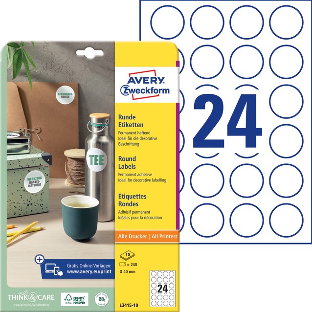 Etiket Avery L3415-10 rond 40mm wit 240 stuks