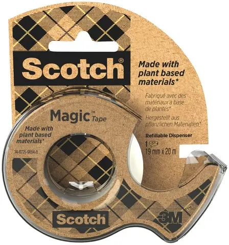 Scotch® Magic™ tape gemaakt met plantaardige materialen is een alternatief voor de originele Scotch® Magic™ tape en biedt dezelfde geweldige prestaties en kleefkracht. Wordt geleverd met een dispenser die compatibel is met diverse Scotch® tapes. 1 rol met dispenser. Greener choice.