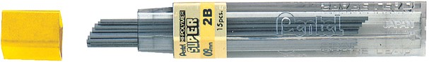 Super hi-polymer stiften 0,9 mm. Hardheid: 2B. Materiaal is een mengsel van kunsthars, grafiet en carbon. Zeer dichte structuur zorgt voor een diepzwarte lijn en exacte lijndikte. Soepel en breukvast. Lengte 60 mm. Dit product bestaat voor 98% uit gerecycled materiaal.