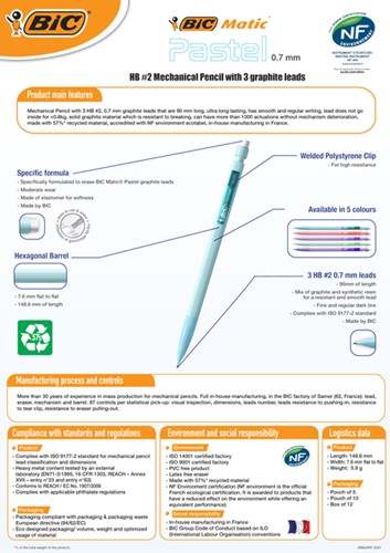 • De BIC Matic Pastel drukpotloodjes zijn gecertificeerd met het NF ECO lablel en zijn gemaakt van 57% gerecycled materiaal.