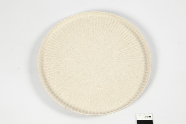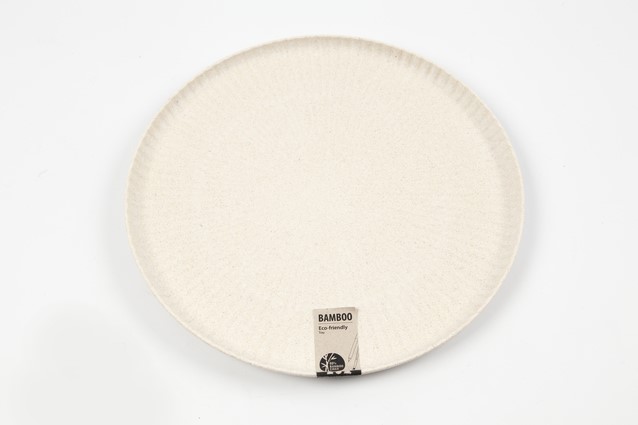 Rond dienblad met een diameter van 30cm en een geplooid patroon gemaakt van bamboevezels. Bamboe vezel met 20% polymeerbindmiddel is een milieuvriendelijk product dat eenvoudig gedecoreerd kan worden met acrylverf, porseleinstiften, enz. Vorstbestendig tot -21° C . Hoogte rand: 2cm.