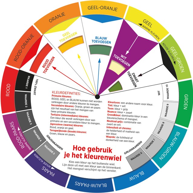 Dit handige kleurenwiel is een onmisbaar hulpmiddel bij het mengen en combineren van kleuren. Door de kleuren in een cirkel te organiseren laat het wiel je zien wat de relatie tussen verschillende kleuren is, wat het effect van het mengen van kleuren zal zijn en welke kleuren goed met elkaar combineren. Draai aan het wiel en je ziet het resultaat als je twee kleuren met elkaar mixt. Je leert over primaire, secundaire en tertiaire kleuren en begrijpt tinten, tonen en schakeringen van tien basiskleuren. Tevens leer je de definities en het gebruik van complementaire, dyadische, triadische en tetradische kleurcombinaties.