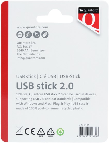 • Sla je bestanden eenvoudig op met de USB-stick van Quantore. Met 128GB opslagcapaciteit en USB 2.0-technologie is deze stick perfect voor het dagelijks gebruik van documenten, foto's en video's. De compacte, lichtgewicht behuizing is gemaakt van 100% gerecycled plastic en voorzien van een beschermkapje voor extra bescherming. Dankzij Plug & Play is de USB-stick direct klaar voor gebruik op zowel Windows- als Mac-apparaten. Kenmerken:
