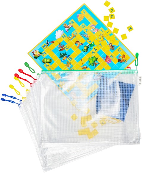• Versterkte transparante opbergtassen van A3-formaat met ritssluiting.