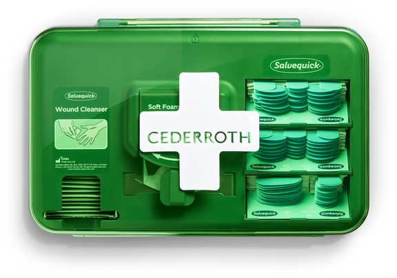 • Inhoud: 1 Salvequick wondreiniger, 40 st. (REF 3227) 1 Cederroth Soft Foam Bandage, 4,5 m (REF 51011010) 2 Blue Detectable pleisters (REF 51030127) 1 Blue Detectable Pleisters Vingertop/Normaal (REF 51030126) 1 Navulsleutel