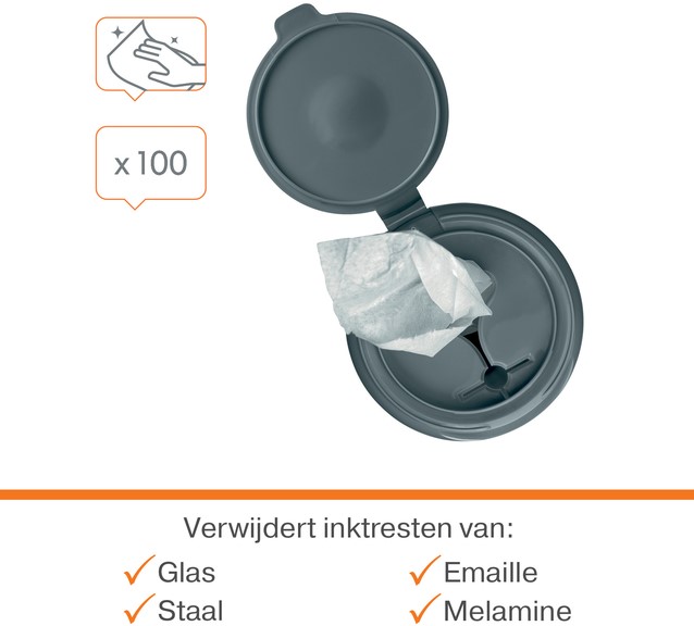 • Verwijdert vuil, aanslag en inktresten van alle droog uitwisbare oppervlakken, zoals glas, email en staal.