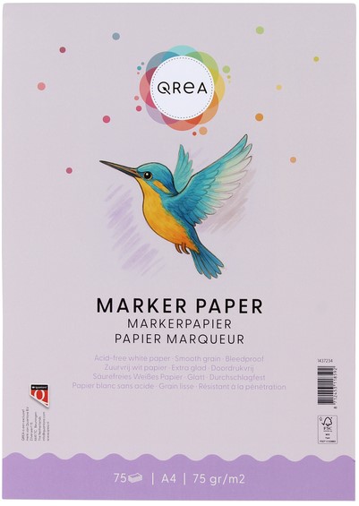 • Markerblok Qrea A4 – 75 vel Het Qrea markerblok is speciaal ontwikkeld voor het nauwkeurig tekenen en inkleuren met markers. Dit A4-blok bevat maar liefst 75 vellen (150 pagina's) van 75 grams optisch wit papier dat ideaal is voor (manga)tekeningen, schetsen en illustraties. Het papier is dun genoeg om onderliggende voorbeelden zichtbaar te houden, maar stevig genoeg om doordrukken van inkt te voorkomen. Markerinkt loopt niet uit of door, waardoor je strakke lijnen en nette kleurvlakken creëert. Ook het opbouwen van kleuren in lagen resulteert in mooie, vloeiende overgangen. Geschikt voor onder andere Copic- en Letrasetmarkers. FSC-gecertificeerd en geproduceerd in Duitsland. Kenmerken: