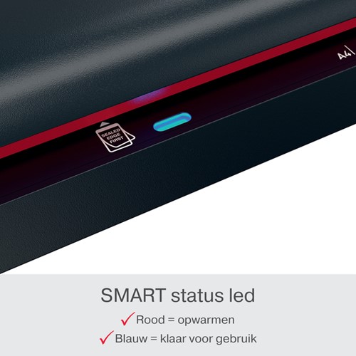 • SMART status led: brandt rood tijdens het opwarmen en wordt blauw met een geluidssignaal wanneer de lamineermachine klaar is voor gebruik.