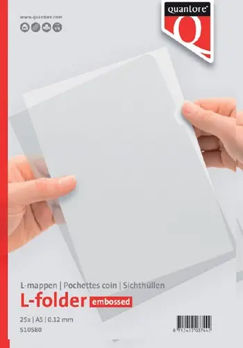• De Quantore L-model insteekmap in A5-formaat is een handige en betrouwbare oplossing voor het beschermen en ordenen van kleinere documenten. Deze transparante map is vervaardigd uit polypropyleen met nerfstructuur en heeft een dikte van 0,12mm (120 micron), wat zorgt voor een stevige en duurzame kwaliteit. De boven- en rechterzijde zijn open, zodat je documenten gemakkelijk kunt in- en uitnemen. Dankzij de copysafe-eigenschap blijven afdrukken helder, zonder verkleuring of vastplakken. Kenmerken: