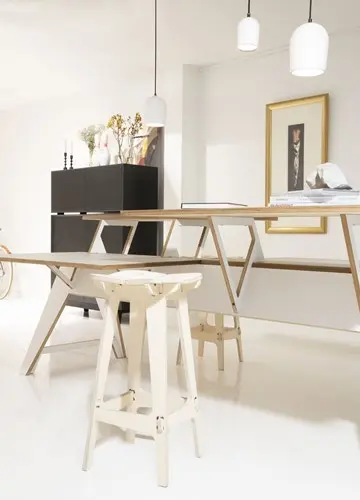 Met Jaap richt je gemakkelijk, flexibel en duurzaam de werkomgeving in. Vanuit een stabiel en stijlvol onderstel kan voor verschillende configuraties van bureaubladen gekozen worden. Zowel op zit- als sta hoogte. Jaap biedt ruimte aan vier werkplekken, maar kan ook worden ingezet als vergadertafel of balie. Jaap is gemaakt van ecologisch geproduceerd Fins berkenmultiplex van Koskisen en kan naar wens worden afgewerkt met een extra top laag van Furniture linoleum. Jaap wordt in elkaar gezet zonder verlijming of andere vaste verbindingen en kunnen makkelijk in en uit elkaar gehaald worden. Dit garandeert een makkelijke omzetting naar een ander model Jaap werktafel en garandeert ook goede mogelijkheden voor hergebruik van het materiaal in de toekomst.