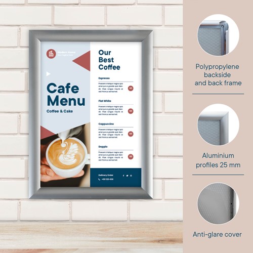 • Ontspiegelde voorzetfolie: De heldere, transparante ontspiegelde voorzetfolie beschermt je poster tegen vuil en vocht, terwijl het zorgt voor een heldere en scherpe weergave van je boodschap.