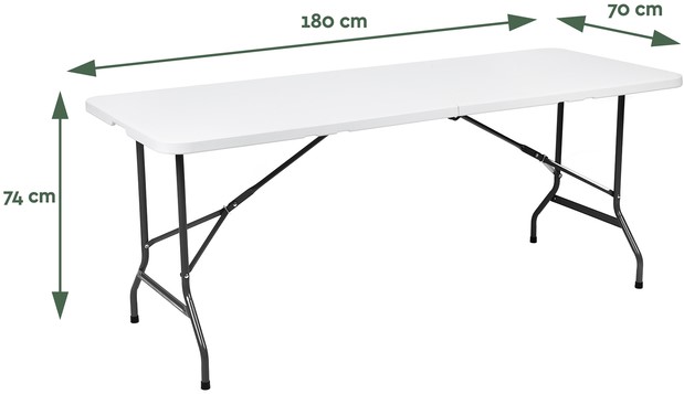 • Betrouwbaar, compact en lichtgewicht: De vouwtafel heeft een afmeting van 180x70x74 (lxbxh) en heeft 2 instelbare hoogtes, zo stel je hem eenvoudig in op 54 en 74 cm hoogte. Perfect voor zowel kleine appartementen als grotere evenementenruimtes. Hij heeft een sterk stalen frame met buizen met een doorsnede van 25mm. Door het lichtgewicht honingraat design weegt de vouwtafel slechts 8,5 kg. Deze inklapbare tafel is gemaakt uit robuuste materialen wat zorgt voor een kwalitatief product, en is daarom zowel binnen als buiten te gebruiken. Dit komt de maximale draaglast ten goede (max 100 kg).