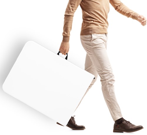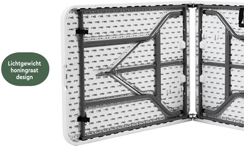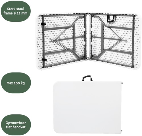 • Onze vouwtafels zijn ontworpen met jouw gemak in gedachten. Ze kunnen eenvoudig worden opgevouwen en opgeborgen, waardoor ze weinig ruimte innemen wanneer ze niet in gebruik zijn. In opgevouwen staat is hij praktisch en compact om te verplaatsen en met zijn handige handvat pak je hem eenvoudig om mee te nemen.