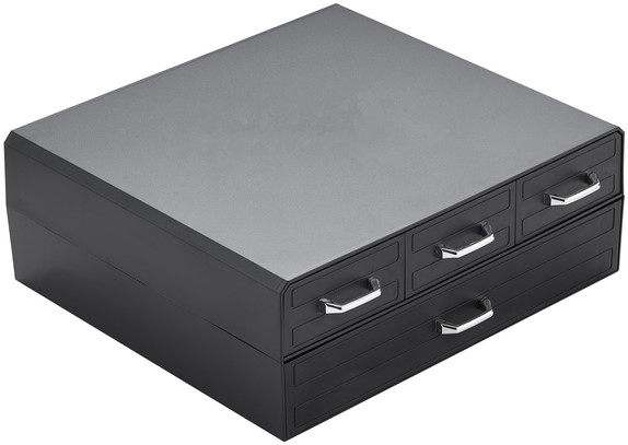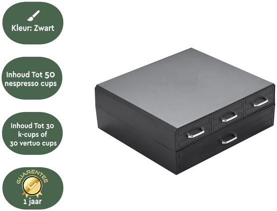 • Altijd zoeken naar een koffiecup? De hele la vol maar alle smaken en soorten door elkaar? De BRASQ Koffiecapsulehouder met 4 lades zorgt ervoor dat al je cups en accessoires netjes georganiseerd voor het pakken liggen. Maar ook alle overige koffie- en thee benodigdheden, zoals suiker- en roerstaafjes en melk, heb je alles overzichtelijk bij de hand. De praktische koffiecuphouder past perfect in de koffiecorner van een autogarage, een badkamershowroom of op kantoor. Maar zeker ook in de keuken van je eigen woning kun je de houder eenvoudig onder of naast je koffiemachine plaatsen. De capsulehouder heeft 4 lades, waarvan de grote onderste is uitgerust met handige vakverdeling voor koffie- en thee accessoires. Samen bieden ze plaats aan 50 cups Nespresso of 30 K-cup of Vertuo cups. Dankzij de vorm kun je de cuphouder perfect onder je koffiezetapparaat bewaren, zodat je ruimte in de keuken bespaart. Deze houder zorgt ervoor dat je voortaan alle koffiecups op een vaste plek hebt liggen. Het zorgt voor ruimte, orde en is een niet te missen item in de koffiehoek. Deze praktische opberger is gemaakt van hoogwaardig kunststof (HIPS) en zijn lades zijn uitschuifbaar. De onderkant is voorzien van een antislip kussentjes waardoor hij netjes op zijn plaats blijft staan en krassen op bijvoorbeeld het keukenblad voorkomt. Stijlvol, ruimtebesparend, praktisch en altijd cups bij de hand. Let op: de cups in de afbeelding worden niet meegeleverd.