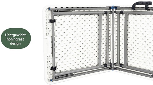 • Betrouwbaar, compact en lichtgewicht: De vouwtafel heeft een afmeting van 120x60x74 (lxbxh) en heeft 2 instelbare hoogtes, zo stel je hem eenvoudig in op 54 en 74 cm hoogte. Perfect voor zowel kleine appartementen als grotere evenementenruimtes. Hij heeft een sterk stalen frame met buizen met een doorsnede van 25mm. Door het lichtgewicht honingraat design weegt de vouwtafel slechts 8,5 kg. Deze inklapbare tafel is gemaakt uit robuuste materialen wat zorgt voor een kwalitatief product, en is daarom zowel binnen als buiten te gebruiken. Dit komt de maximale draaglast ten goede (max 80kg). De opvouwbare tafel is gemaakt van HDPE kunststof en bevat gerecyclede materialen. Mede hierdoor heeft het blad van de tafel een gemêleerde witte kleur (deze is dus niet effen wit).