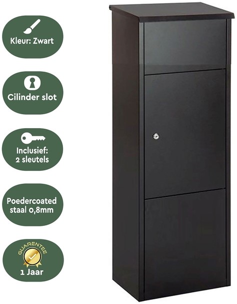 • Materiaal en uitvoering: De zwarte dropbox is gemaakt van duurzaam en robuust materiaal dat zorgt voor een lange levensduur. Afgewerkt met gegalvaniseerd poedercoated staal, zodat je pakketten bestand zijn tegen alle weersinvloeden. De pakketbrievenbus heeft een formaat van 105x38x24cm. Met de ruime brievenbus opening passen er pakketten in met een maximaal formaat van 33.5x20cm. Gebruiksvriendelijk en veilig: Pakketten en post zijn te deponeren door de bovenklep op te tillen. Wanneer de klep sluit wordt het pakket of de brief automatisch doorgeschoven naar het onderste compartiment. Hier worden ze veilig bewaard achter een gesloten deur. Door de terugslagklep is het onmogelijk om brieven en pakketten uit de box te halen en daarmee diefstal veilig. Het stevige cilinderslot, inclusief 2 sleutels, zorgt ervoor dat alleen jij toegang hebt tot je ontvangen post en pakketten.