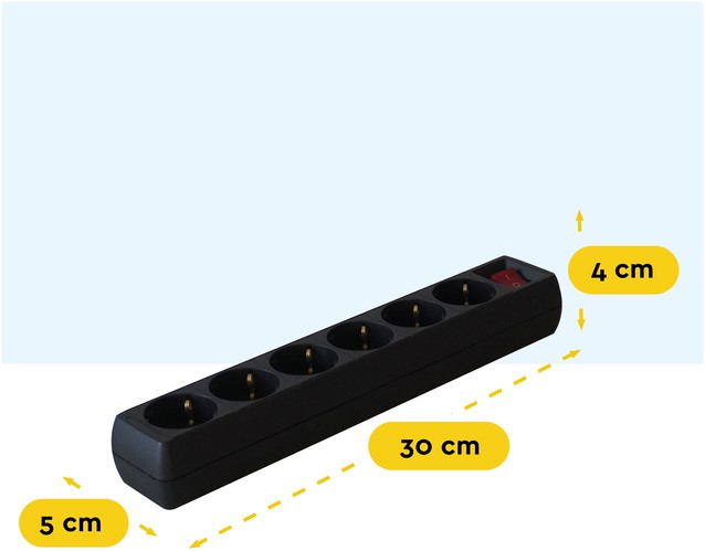 • De stekkerdoos met 6 sockets, die geschikt is voor binnenshuis gebruik, is voorzien van geaarde stopcontacten en een hoofdstekker met PEN-aarde. Hij heeft een compacte afmeting van 30x5x4cm en biedt dus een oplossing voor de meest krappe ruimtes. De stekkerdoos is direct klaar om te gebruiken en geschikt voor geaarde en niet-geaarde apparaten.