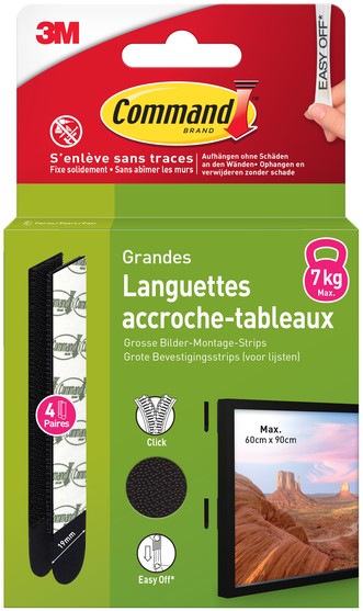 • Command™ Grote zwarte bevestigingsstrips zijn onze innovatieve oplossing voor het veilig en zonder beschadigingen ophangen van grotere of zwaardere ingelijste afbeeldingen en kunstwerken. Ze hechten sterk en laten na verwijdering geen sporen achter dankzij de 3M rekontgrendelingstechnologie.