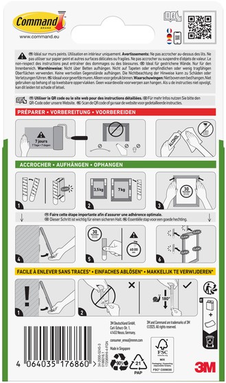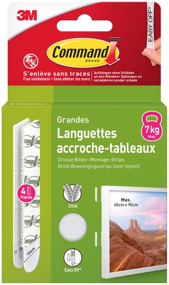 • Command™ Grote bevestigingsstrips zijn onze innovatieve oplossing voor het veilig en zonder beschadigingen ophangen van grotere of zwaardere ingelijste afbeeldingen en kunstwerken. Ze hechten sterk en laten na verwijdering geen sporen achter dankzij de 3M rekontgrendelingstechnologie.