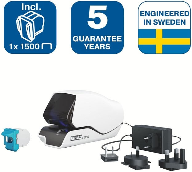 • Moeiteloze, gepatenteerde casette niettechnologie voor nieten met hoge frequentie, zoals bij hotelrecepties en kassa´s. LED begeleidingssyteem toont precies waar het nietje komt.