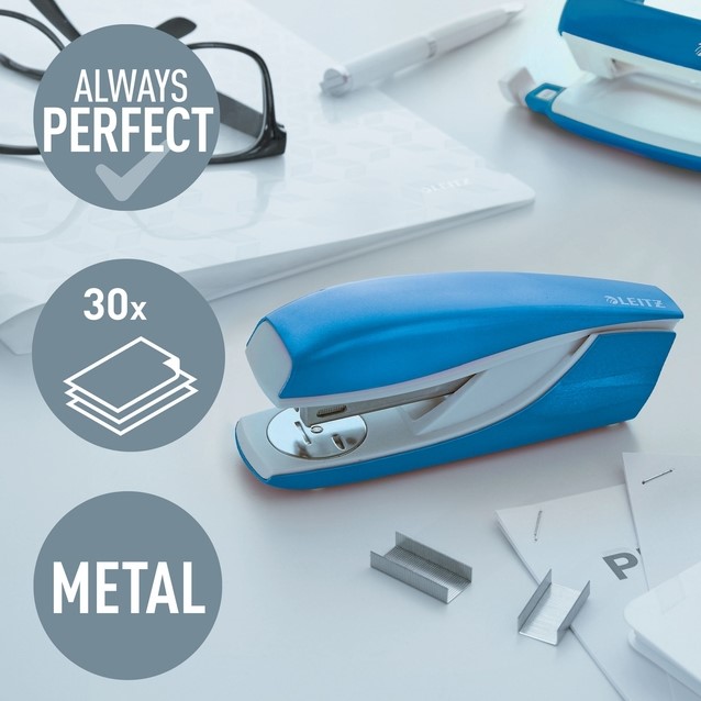 Met deze mooie metalen nietmachine van Leitz kun je heel nauwkeurig nieten. Je kunt maar liefst 30 papieren aan elkaar nieten als je zou willen. Handig toch?!