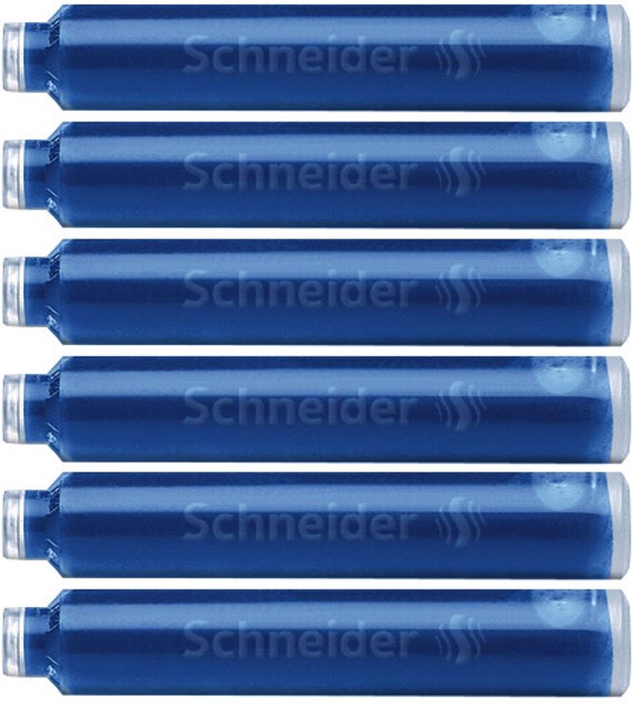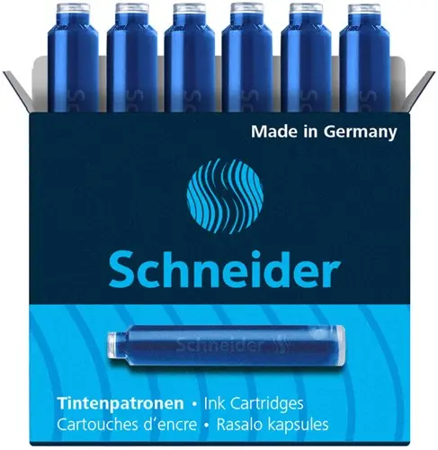 Standaard formaat inktpatronen met kogelsluiting. Passend in de vulpennen van Schneider, Pelikan en vele andere merken. De koningsblauwe inkt is uitwisbaar. Schneider is Emas gecertificeerd.