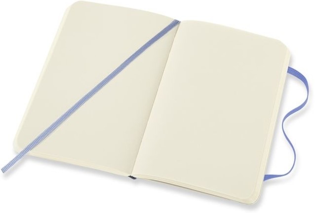 Kenmerken: afgeronde hoeken, elastische sluiting, ivoorkleurig Moleskine-papier, bijpassend leeslint, papier: 70 gsm, zuurvrij, “In geval van verlies”-label op het schutblad, uitbreidbaar binnenvak op achterkaft.