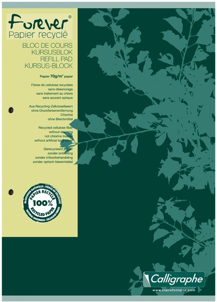 FOREVER gerecycled cursusblok A4 70g 100 blad - 2 gaats perforatie gelijnd + kantlijn Een uniek assortiment gemaakt van 100% gerecycled papier met natuurlijke witheid, zonder ontinkting of optische witmakers.De FOREVER-kwaliteit is gemaakt van 100% post-consumer oud papier in onze Everbal-fabriek in Frankrijk. Bijzonderheid: de papiermachine wordt gevoed door hernieuwbare energie, verwarming met biomassa van fossiele oorsprong zonder CO2-uitstoot. Uitscheurbare en geperforeerde bladen met 2 gaten van 80 mm om gemakkelijk in een ordner of ringband te integreren. 70 g papier 100% gerecycled, met natuurlijke witheid. Gerecyclede omslag