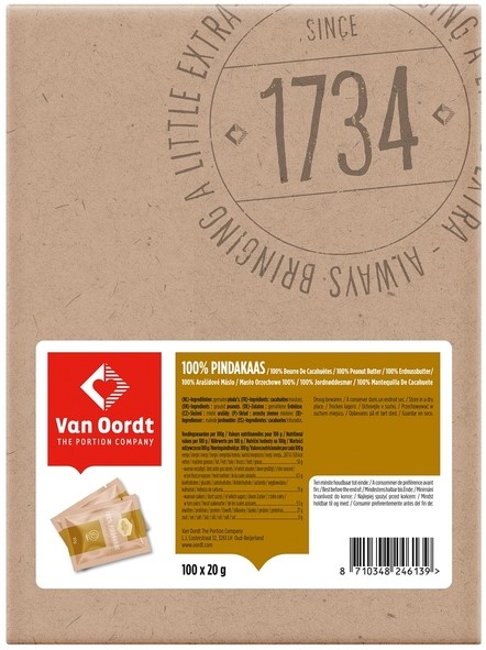 Verpakt in praktische en hygiënische eenpersoons zakjes. Éen zakje bevat 20 gram pindakaas. Leverbaar in een omdoos à 100 stuks.