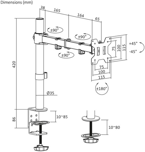 Ontwerp uw werkplek met de Quantore monitorarm, perfect voor schermen van 17" tot 27". Vervaardigd uit een combinatie van staal, aluminium en kunststof, en afgewerkt met een poedercoating in matzwart, biedt deze monitorarm een stijlvolle en stevige oplossing voor uw beeldschermbehoeften. De arm is geschikt voor een gewicht tot 10 kg en ondersteunt VESA-maten van 75x75 en 100x100, wat zorgt voor brede compatibiliteit met de meeste monitoren. De volledig verstelbare structuur biedt een kantelbereik van +45° tot -45°, een zwenkbereik van +90° tot -90°, en een volledige schermomwenteling van +180° tot -180°, waardoor u uw scherm moeiteloos kunt positioneren voor de beste kijkervaring. De monitorarm kan zowel via een klem- als een tulebevestiging worden geïnstalleerd, geschikt voor bureaubladdiktes van 10 tot 85 mm (klem) en 10 tot 80 mm (tule), waardoor deze arm zeer flexibel inzetbaar is op verschillende werkplekken. Met de geïntegreerde kabelclips blijft uw werkruimte netjes en georganiseerd, vrij van rondhangende kabels. Kies voor de Quantore monitorarm om comfort en functionaliteit aan uw werkplek toe te voegen, terwijl u ook de fysieke belasting tijdens lange werkdagen vermindert. Kenmerken: