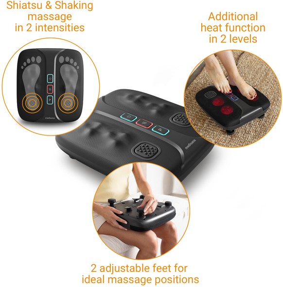 Er zijn twee massageprogramma's in twee intensiteiten beschikbaar: Klassieke Shiatsu-massage van de voetzolen of de combinatie van Shiatsu- en schudmassage voor extra vitalisering van de benen. De schakelbare warmtefunctie in twee standen zorgt voor nog meer ontspanning en comfort. Het geïntegreerde bedieningspaneel met extra grote knoppen kan moeiteloos en gemakkelijk met de voeten worden bediend ("toe-touch control")