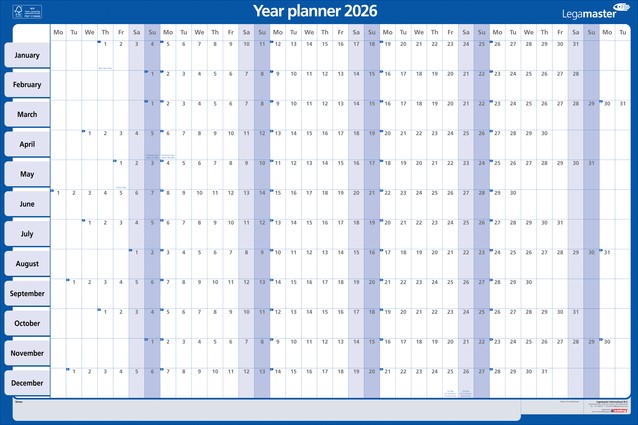 Jaarplanner 2026 Legamaster 90x60cm horizontaal gelamineerd Engelstalig