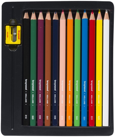 De verpakking bevat 12 driekantige kleurpotloden in de populairste kleuren en een bijbehorende slijper.