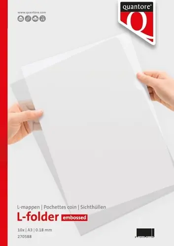 De Quantore insteekmap in L-model is de ideale oplossing voor het beschermen en presenteren van A3-documenten. Gemaakt van stevig en transparant polypropyleen met een lichte nerfstructuur, waardoor je documenten goed zichtbaar blijven en tegelijk beschermd zijn tegen vuil, stof en beschadigingen. Dankzij het L-model zijn de boven- en rechterzijde open, wat het eenvoudig maakt om papieren in en uit te nemen. De map is copysafe, zodat je afdrukken niet verkleuren of vastplakken. Kenmerken: